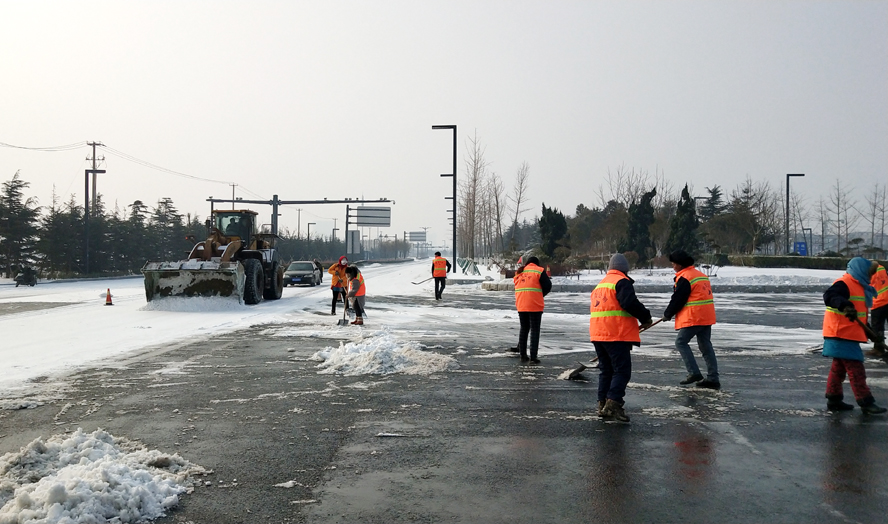 由于28日最高氣溫只有1度,路面積雪很難融化,當(dāng)天又恰逢周末,是居民大量外出的時段。為了確保人、車流高峰期間交通安全,華茂公司職工放棄周末休息,精心組織,緊密協(xié)調(diào)。從早上7點(diǎn)起,就組織工人在花果山大道、黃海大道、東方大道、新光路下穿涵洞、火車站匝道等路段撒布氯化鈣,加速積雪融化,防止路面低溫降雪產(chǎn)生冰凍,為及時掃除冰雪和確保居民正常出行提供保障。該公司組織職工近300人次,鏟車、平板車、裝載機(jī)、工程車輛等作業(yè)機(jī)械十余臺(班)投入到掃除積雪工作中去,使用氯化鈣十余噸。截止28日下午4時,經(jīng)過近一天的緊張作業(yè),各條主干道積雪基本清理完畢,道路恢復(fù)通暢。