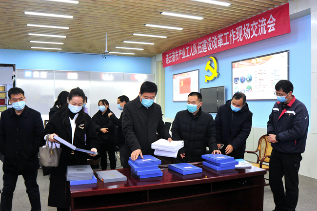 12月7日上午,連云港市總工會黨組書記、副主席丁維杰和工會副主席陳健一行15人來到氨綸公司,通過查閱臺賬,聽取工作匯報等形式對我公司產(chǎn)業(yè)工人隊伍建設(shè)改革工作亮點工作及經(jīng)驗做法開展交流,集團(tuán)黨委副書記戴鴻鳴、集團(tuán)工會主席劉承志、公司總經(jīng)理張斌出席交流會。