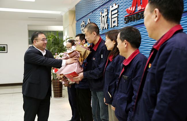 楊董事長進基層、到一線,與勞模先進面對面交流,傾聽他們的心聲和意見,感謝他們長期以來為企業(yè)發(fā)展作出的貢獻,并獻上一束鮮花、送上一封慰問信、發(fā)放一張蛋糕卡、特制一張健康卡、送上一份祝福。