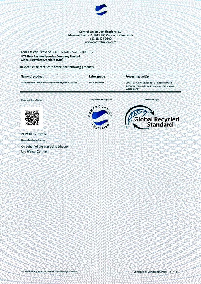 2019年10月9日,連云港杜鐘新奧神氨綸有限公司通過全球回收標準認證,取得GRS證書,即獲得對再生氨綸纖維生產的資質,可根據客戶需要提供貿易證書(TC)和全球認可的GRS吊牌。