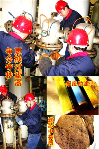 他們中間既有“技能大師”、市級(jí)“五一勞動(dòng)獎(jiǎng)?wù)?rdquo;獲得者設(shè)備“醫(yī)學(xué)專家”—伏彩兵,也有不見(jiàn)經(jīng)傳的普通一線維修員工。近期,公用工程部人員發(fā)現(xiàn)1#空分制氮機(jī)組氣壓降低1個(gè)表壓,能耗上升,氮?dú)饧兌群彤a(chǎn)氣量雙降,有報(bào)警停車隱患,經(jīng)維修和自主維修“醫(yī)生”緊急會(huì)診,診斷為“芯梗”,需要立即“換芯”(更換空氣過(guò)濾器濾芯),面對(duì)突發(fā)情況,為保證生產(chǎn)安全運(yùn)行,維修人員自覺(jué)加快維修進(jìn)度,加班加點(diǎn)開(kāi)展濾筒解體,吊裝,換芯,復(fù)位等工作,提前兩小時(shí)完成搶修任務(wù),原“芯梗”制氮機(jī)組進(jìn)氣運(yùn)行后壓力恢復(fù)正常,隱患解除。