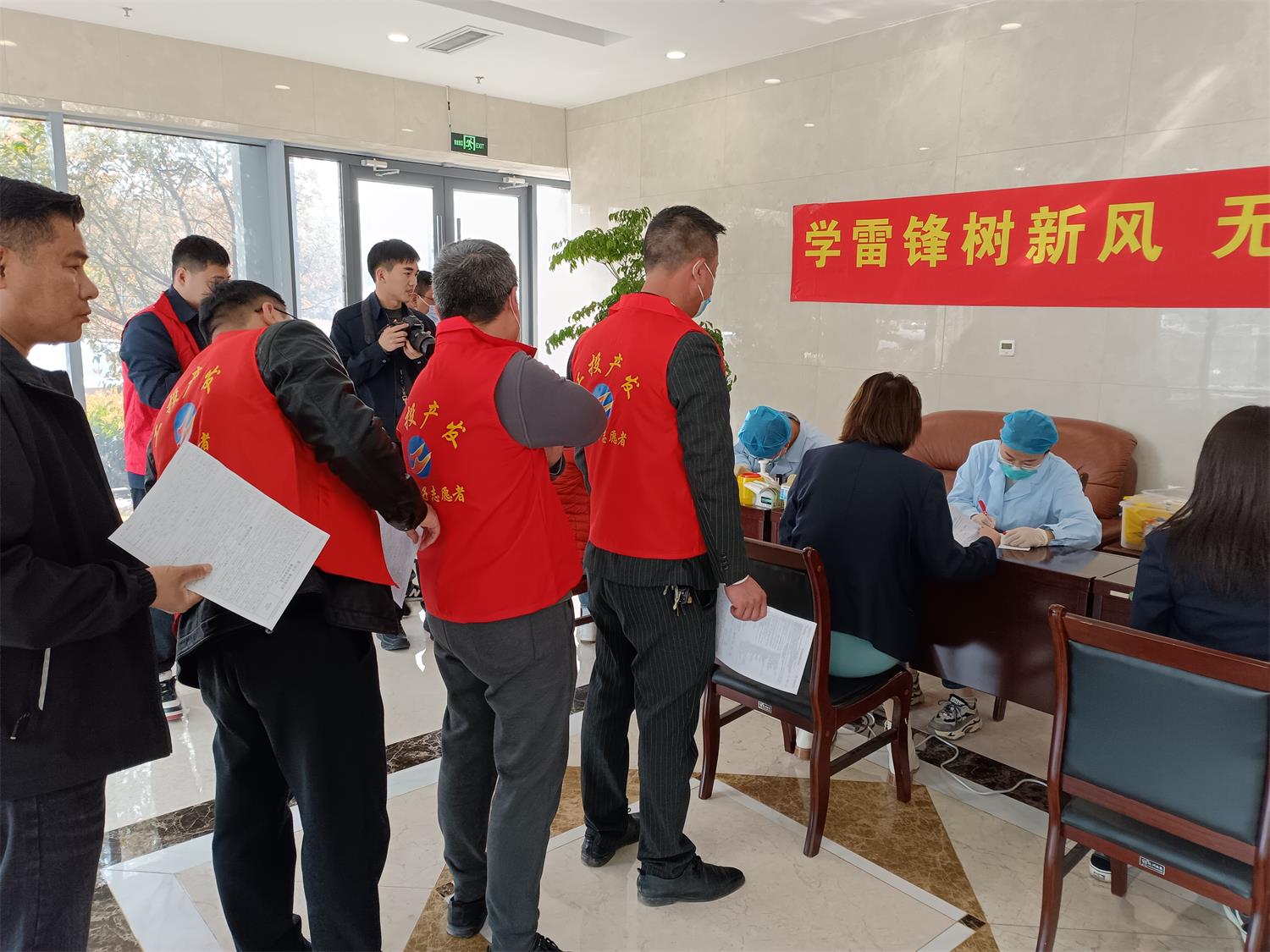 參加無償獻血的志愿者早早就來到了獻血地點,熱情洋溢而又井然有序地排隊,等候醫(yī)生給獻血者檢查血壓、脈搏和詢問相關信息。檢查通過后,獻血者依次進入獻血車進行獻血。
