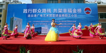 為了貫徹黨的群眾路線教育實踐活動精神,豐富基層職工的精神文化生活。628日上午,由連云港廣電傳媒集團和集團公司共同主辦的“踐行群眾路線,共架幸福金橋”連云港廣電藝術團走進鹽場職工小區文藝演出在猴嘴昌圩湖社區拉開帷幕。廣電傳媒集團領導戴詠寒、馬富勝、萬自力,集團公司領導顧永庚、鄭宜虎、戴鴻鳴與數百名鹽場職工群眾歡聚昌圩,共同欣賞來自連云港廣電新聞綜合頻道的主持人和編輯記者與金橋職工自編自演的精彩節目。