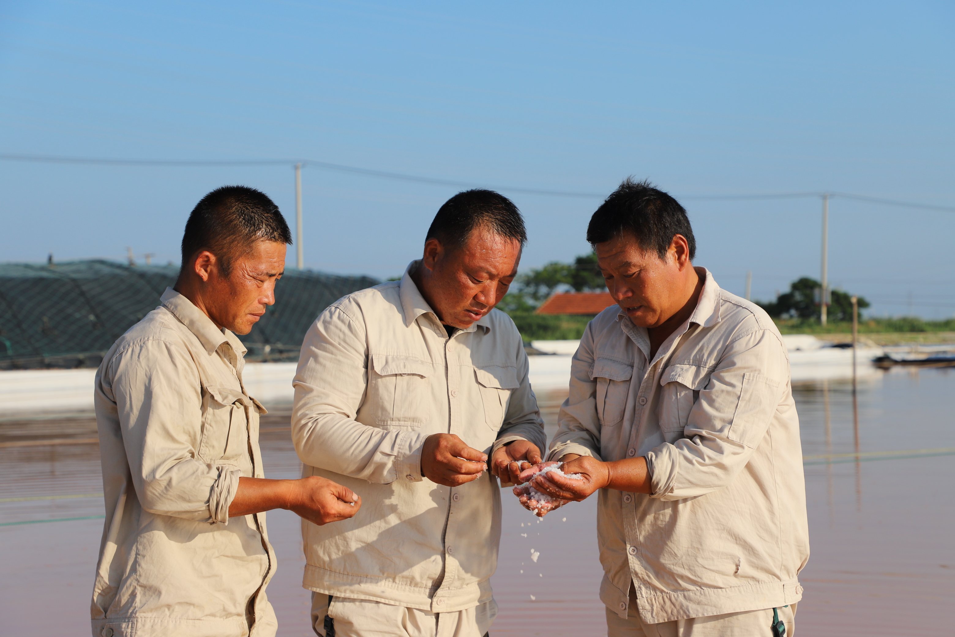 “氣溫越高,鹽的蒸發(fā)量就越高,公司效益就好,按今年的產(chǎn)鹽趨勢(shì),超額完成公司指標(biāo)任務(wù)應(yīng)該不成問(wèn)題,我們工人心里也高興呀!”勞模祝星星擦著臉上的汗珠自豪的說(shuō)道。“晴天一身汗,雨天一身泥”是制鹽人的家常便飯,為確保汛期安全生產(chǎn),避開(kāi)高溫時(shí)段作業(yè),凌晨五點(diǎn)鐘,工人們已忙著鹵水除硫、維護(hù)收拉塑布收房系統(tǒng)、修補(bǔ)塑布……。鹽工身上的汗水與鹵水交織在一起,浸濕了工作服,透過(guò)驕陽(yáng)他們黝黑的臉龐顯得越發(fā)的锃亮。