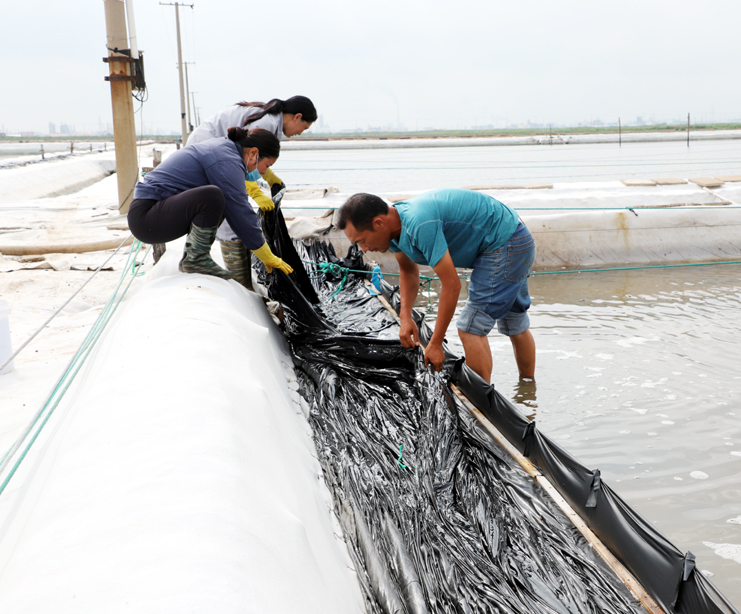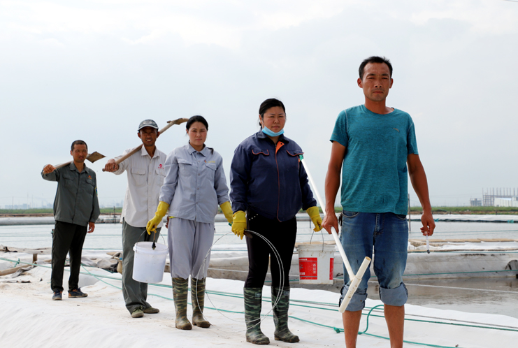 8月15日早,在制鹵區(qū)2班,班長(zhǎng)王春好帶著班組的工人準(zhǔn)備干活,安排好每個(gè)人的工作后,大家拿起工具上灘,工人們分散開來,各自忙著手里的活。工人們前后排開,彎腰俯身,用鐵鍬挖溝做堰,為下雨排淡水做好準(zhǔn)備。“踩在鹵水里能感覺像是在“燙腳”,太陽(yáng)把鹵水曬的滾燙的。”領(lǐng)灘手王春好用衣袖擦著臉上的汗水說,自己在灘上干了有七、八年了,對(duì)于這樣的工作環(huán)境已經(jīng)適應(yīng)了。進(jìn)入八月以來,連續(xù)7天最高溫度達(dá)到35以上,臺(tái)風(fēng)過后,今天的氣溫也達(dá)到了33度,令今年這個(gè)夏天,成為有完整氣象記錄最熱的夏天。跑水工仇海濱,到灘上一個(gè)多小時(shí),以是大汗淋漓,他帶領(lǐng)工人做一些修堰、補(bǔ)塑布、緊繩、還有查跑道頭的活。