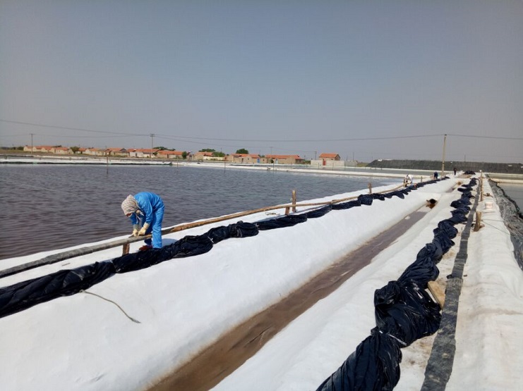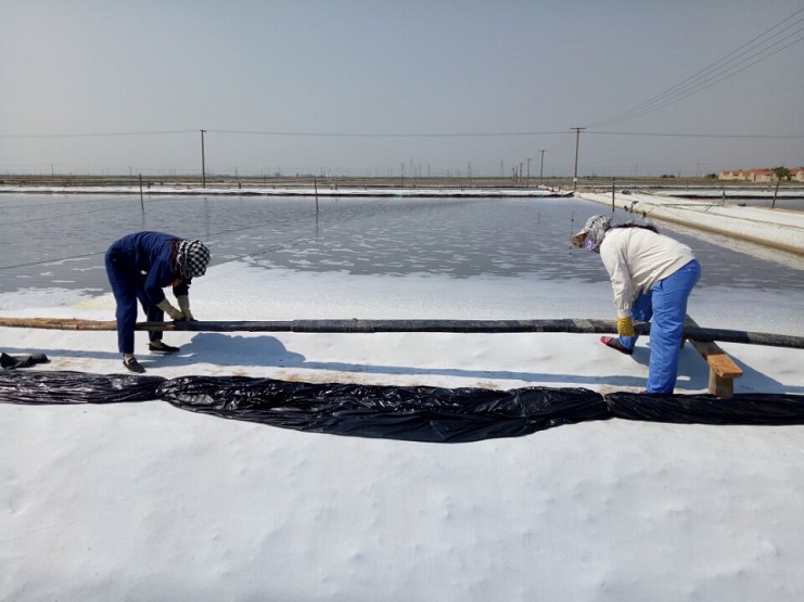 分公司海鹽基地二班近階段正在上塑布。班組全員先壓浮板、裹浮板、釘老樁,裝布,目前該班組已上塑布三塊六十公畝,計劃上九塊一百八十公畝。(實業公司)