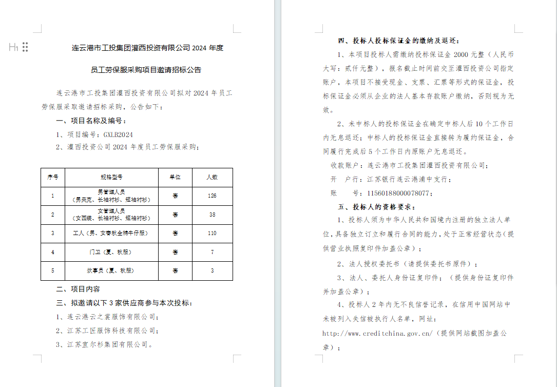 連云港市工投集團灌西投資有限公司2024年度員工勞保服采購項目邀請招標公告