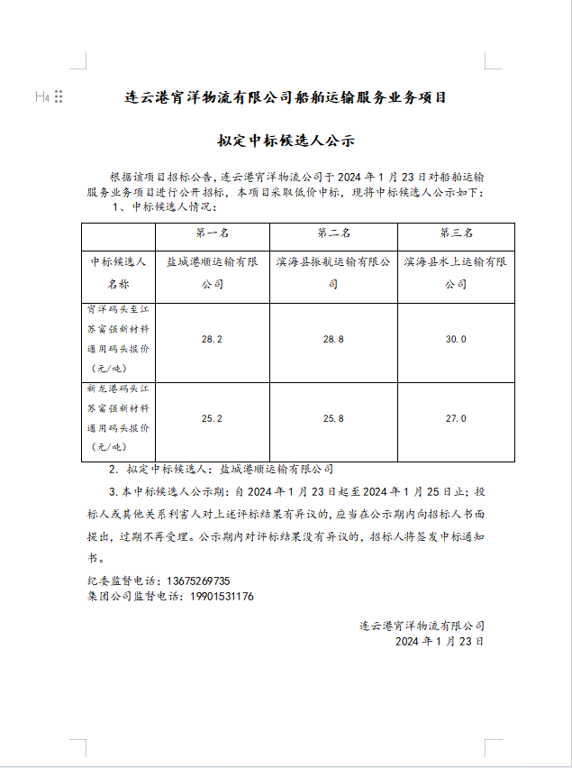 連云港宵洋物流有限公司船舶運輸服務業(yè)務項目擬定中標候選人公示