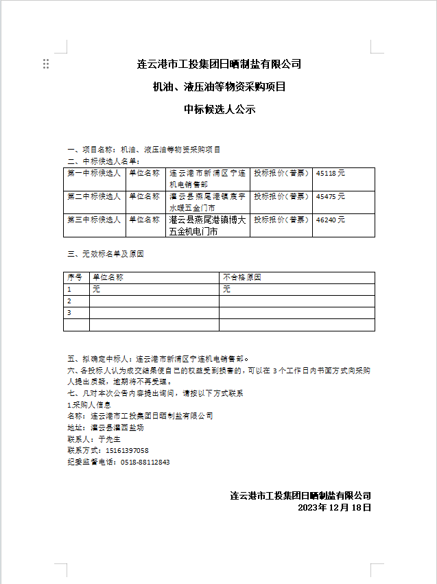 連云港市工投集團日曬制鹽有限公司 機油、液壓油等物資采購項目中標候選人公示