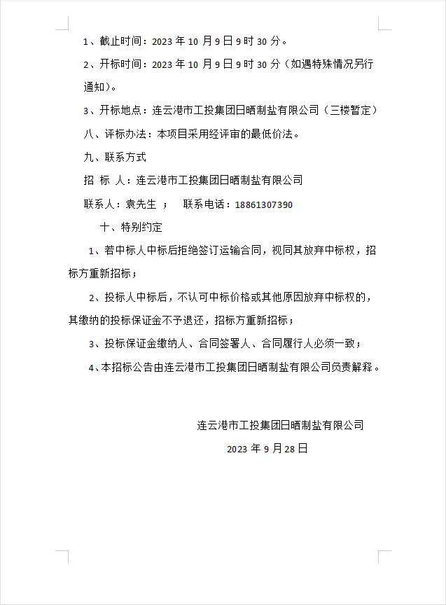 連云港市工投集團日曬制鹽有限公司海運物流服務業(yè)務招標公告