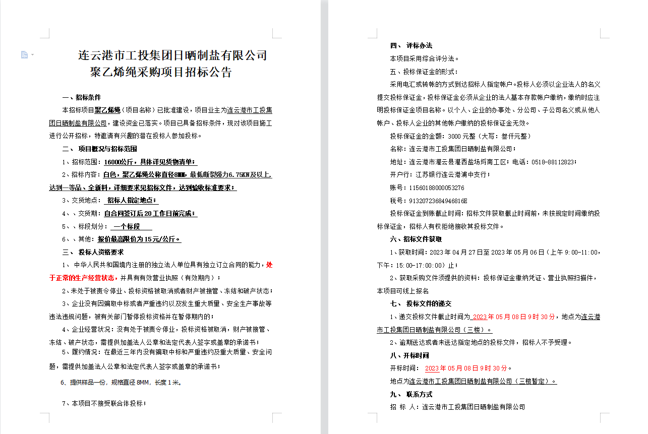 連云港市工投集團日曬制鹽有限公司聚乙烯繩采購項目招標公告