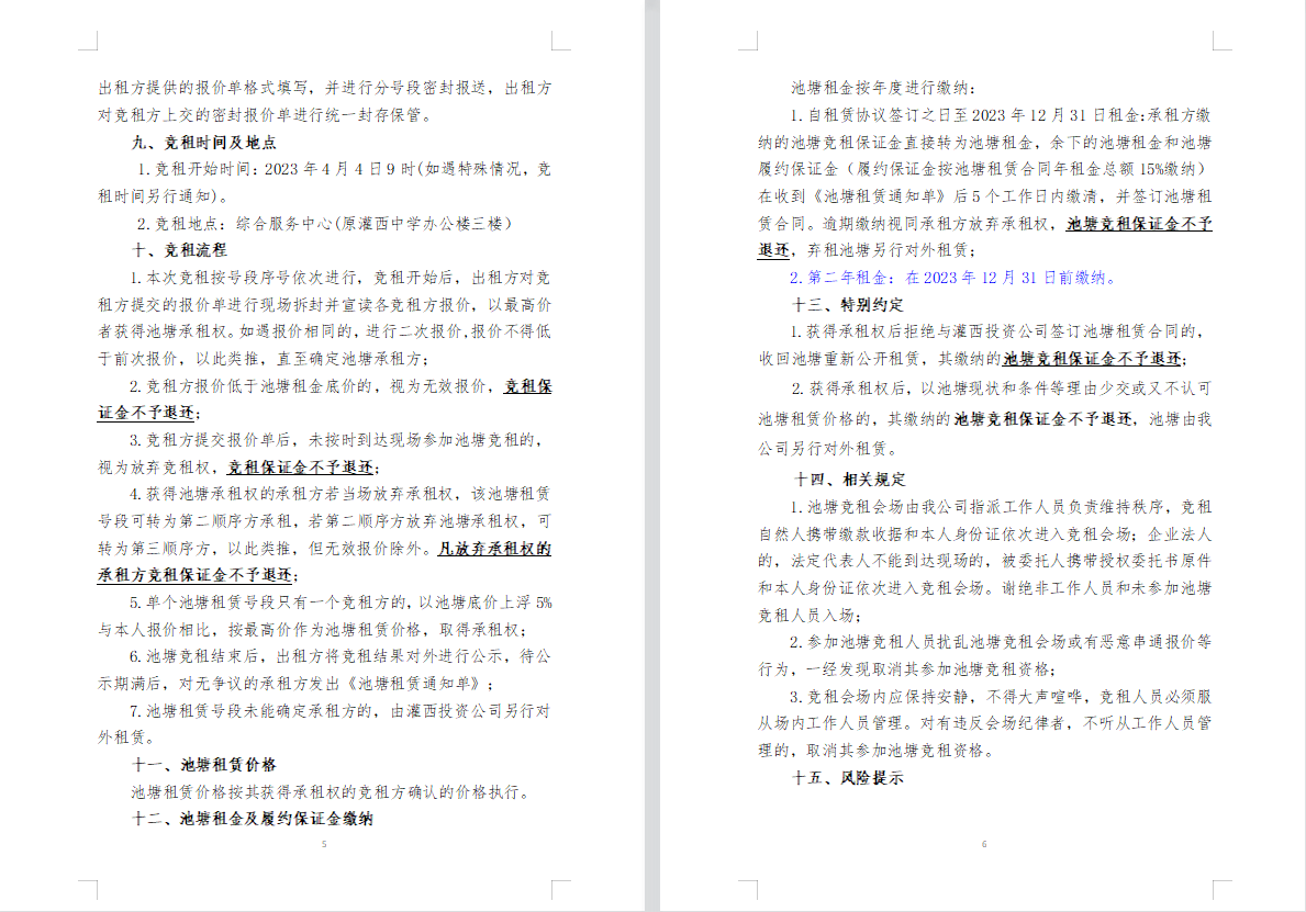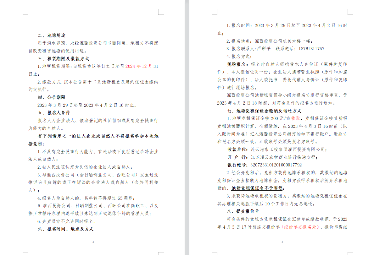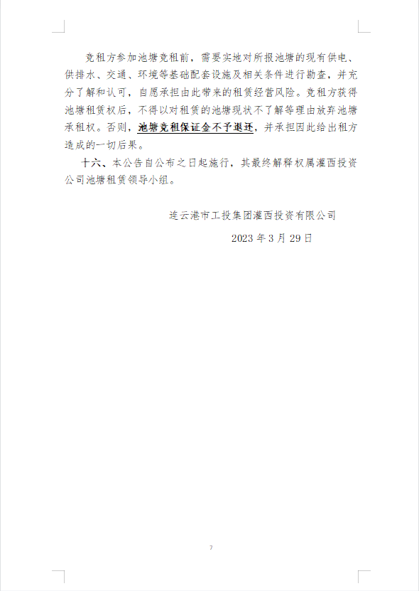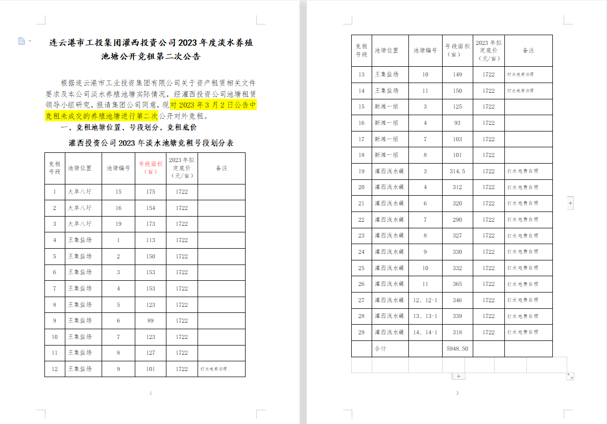連云港市工投集團(tuán)灌西投資公司2023年度淡水養(yǎng)殖池塘公開競租第二次公告
