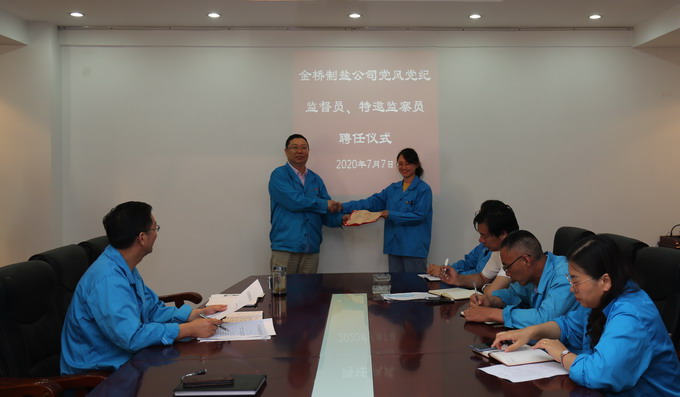 為進一步加強黨風廉政建設,拓寬監督渠道,構建黨內監督、行政監察與群眾監督相結合的監督制約機制,77日,我公司在二樓會議室舉行黨風黨紀監督員、特邀監察員聘任儀式,黨委書記、董事長、總經理朱桂玉為盧明江、徐元等6名黨風黨紀監督員和徐永亮、陳東等6名特邀監察員頒發了聘書。(金宣 金紀)