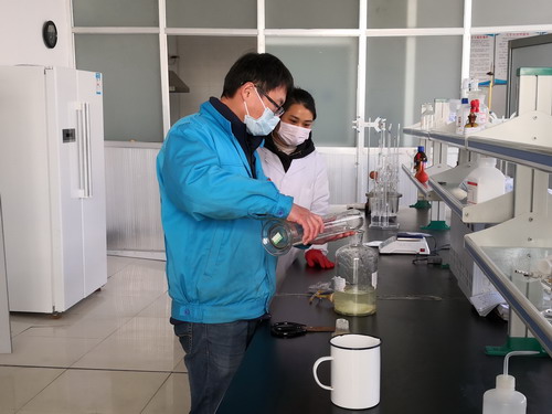 化驗室副主任徐永亮(左一)配制消毒液
