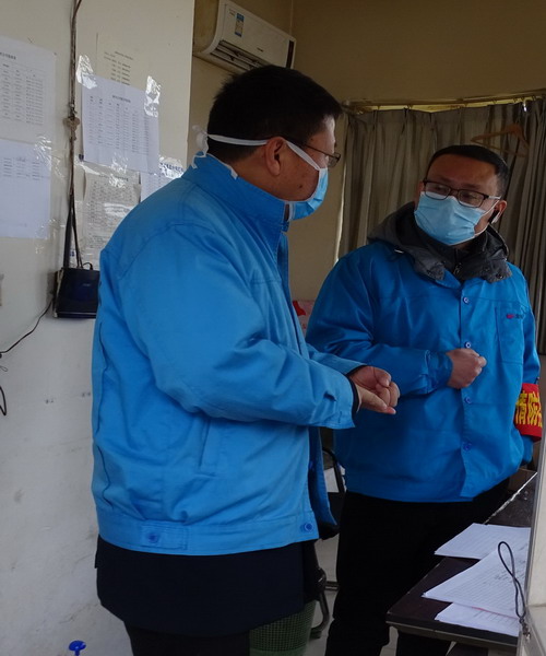 李忠祥檢查門衛進場人員測體溫情況(左一)
