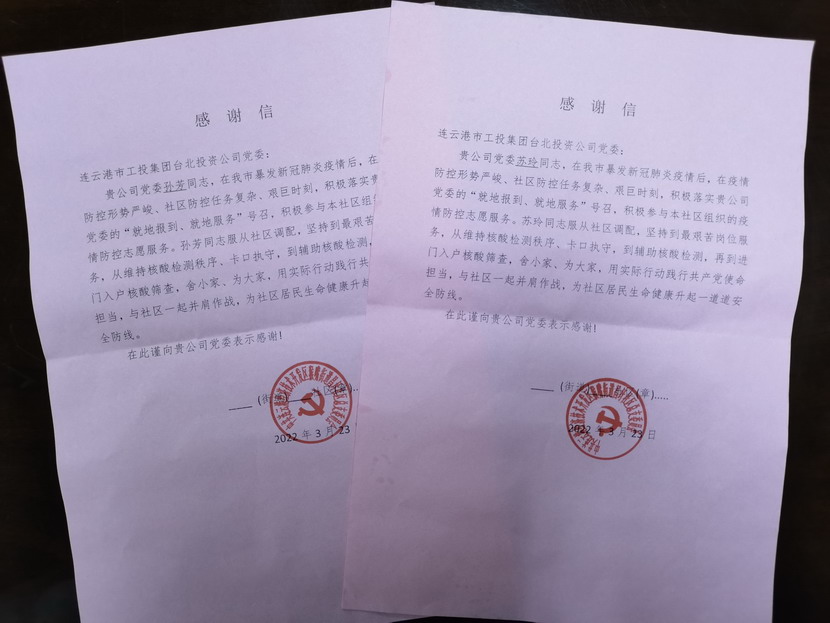 “臺北投資公司的黨員同志們視疫情防控為己任,服從調度安排,站好每一班崗,不僅認真履行防控職責,又創新開展疫情防控教育宣傳、便民服務等多項活動,成為我們社區防疫攻堅的主力軍。”3月25日,收到開發區猴嘴街道昌圩社區送來的一份特殊的“禮物”— 一封疫情防控感謝信,感謝臺北投資公司黨員蘇玲、孫芳等同志在新冠肺炎疫情防控的關鍵階段挺身而出、伸出援手,參與協助社區的疫情防控工作。