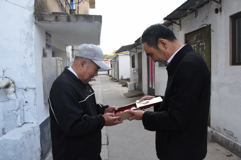 解韻波同志今年83歲,1956年1月參軍,那年19歲,同年6月經過短期高強度培訓,作為無線電通訊兵出國抗美援朝。1959年西藏達賴集團發動叛亂,剛回國不久的解韻波作為無線電技術兵種隨即跟隨大部隊入藏平叛。至今他仍保留著抗美援朝軍功章,入藏平叛軍功章、紀念章等。1962年退伍分配至臺北鹽場工作,1997年退休。今天慰問的時候,在鄰居們的簇擁和艷羨之中,還沒進家門,鄰居們就迫不及待地要求打開“紀念章”一睹風采。紀念獎章掛在老戰士胸前,一眾鄰里夸贊不斷:這份榮譽沉甸甸的。這份榮譽是拿命換來的。這是不得了的榮譽啊。這樣的老兵是我們的寶貝哦,我們要尊敬啊。……就在小區活動廣場上,老戰士與大家暢談起保家衛國光榮的戰斗經歷,烽煙往事歷歷在目。退伍后,不褪軍人本色,幾十年如一日立足家鄉建設,為臺北鹽場奉獻青春,為國家建設貢獻力量。大家對解韻波老戰士的革命戰斗和建設祖國的歷程表示由衷贊嘆和敬佩。