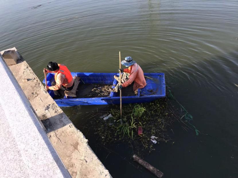作業過程中,打撈人員因地制宜,采取分段清理、圍攔堵截、水上打撈等方式進行打撈,有的坐在船上用濾網、鉤耙等工具清理河面雜草,有的在岸邊將水草打撈上岸,并其進行集中處置,防止對河道造成二次污染。通過3個多小時的清理打撈,河道中的水流恢復暢通。