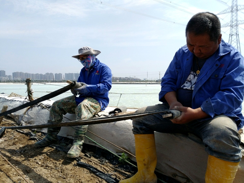 因礦鹽鹵水清,結晶速率快,在長鹽的過程中極易附著于浮板上,增加了浮板的重量,不利于浮板的漂浮,嚴重影響塑布的收放,急需將原1680公畝鈣鹽結晶池里的浮板進行更換,共28條,2800米。為了效益最大化、成本最小化,大浦工區回收3、4、14、15班已征結晶池的舊浮板進行晾曬,并利用廢舊的塑布進行同規格的裁剪包裹在浮板上,程序繁瑣,工作量巨大。東灘的15名員工加班加點,搶抓有利天時,確保雨季到來之前塑布收放正常,多產鹽、產好鹽,促進春曬制鹵確保原鹽生產良性運轉夯實基礎。